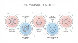 乾燥も見た目年齢を左右します。肌表面の水分が不足するとキメが乱れ、細かなちりめんジワが目立ちやすくなることが、保湿状態と弾力を比べた研究でも示唆されています(参考: Relationship between skin hydration and elasticity, Academia.edu(英語))。つまり、シワには「土台」「バリア」「乾燥」「表情」「紫外線」の五つの要素が絡み合っていると考えるとイメージしやすいでしょう。