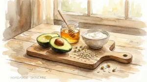 例えば、熟したアボカドとハチミツを混ぜたマスクは、脂質とうるおい成分を補う目的で、バナナやパパイヤのマスクは、ビタミンや天然の酵素でなめらかな質感を目指す目的で紹介されています。ヨーグルトとハチミツの組み合わせは、乳酸による穏やかな角質ケアと保湿を同時に狙うレシピとして知られています。多くのレシピでは、顔全体に薄く塗り、約15〜20分おいてからぬるま湯でやさしく流す方法が推奨されています(参考: Continental Hospitals(英語)、Healthline(英語))。